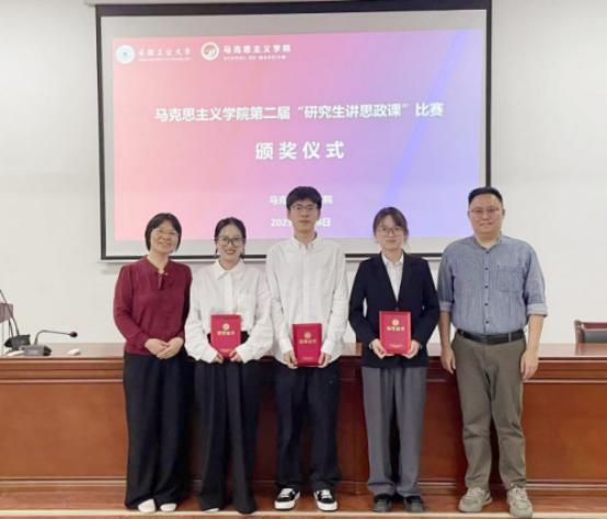 为提升我院研究生马克思主义理论学科专业能力,展现学生学习思政课的理论素养和精神风貌,搭建展示自我和交流学习的实践平台,5月8日,马克思主义学院以“建设教育强国,提升思政引领力”为主题,在学院325报告厅举行第二届“研究生讲思政课”比赛。比赛邀请马克思主义学院党委书记徐惠老师、陆春晖老师、汪宏老师、许醴老师、庞东霞老师担任评委,全体研究生参加。