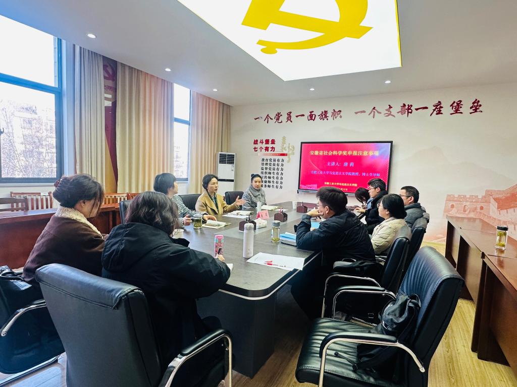 为扎实推进有组织科研,切实提升学院教师申报安徽省社会科学奖的质量与成效,1月15日上午,学院于324会议室举行安徽省社会科学奖申报辅导报告。学院邀请合肥工业大学马克思主义学院博士生导师唐莉教授做了题为“安徽省社会科学奖申报注意事项”的辅导报告,对申报省社科奖的老师进行现场指导,申报教师、科研骨干及青年教师参加,会议由郑洁院长主持。