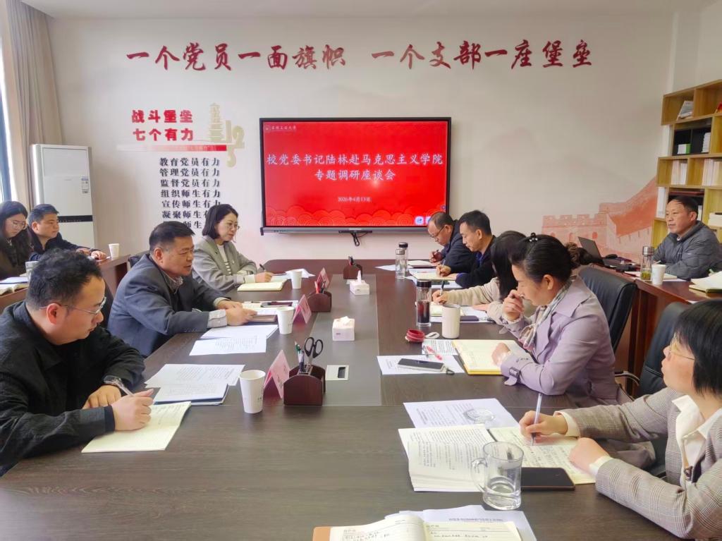 为深入学习贯彻党的二十届四中全会精神,推动全校树立和践行正确政绩观学习教育走深走实,4月13日上午,校党委书记陆林一行深入马克思主义学院,开展“践行‘一线规则’、解决急难愁盼”专题调研,现场办公破解发展难题。校党委常委、党委宣传(统战)部部长王菁,党办校办副主任盛樟,马克思主义学院领导班子成员、师生代表参加座谈会,学院党委书记徐惠主持会议。